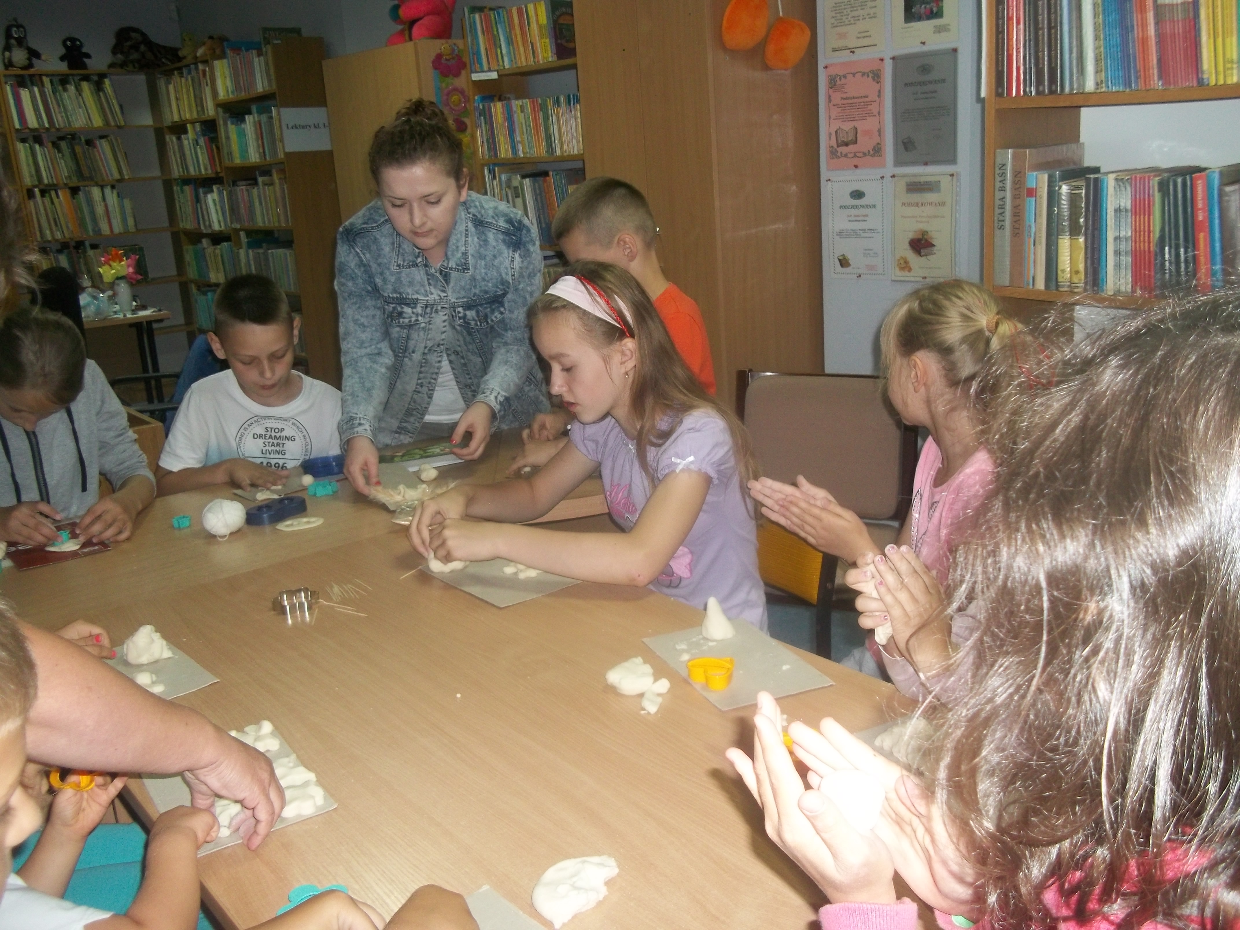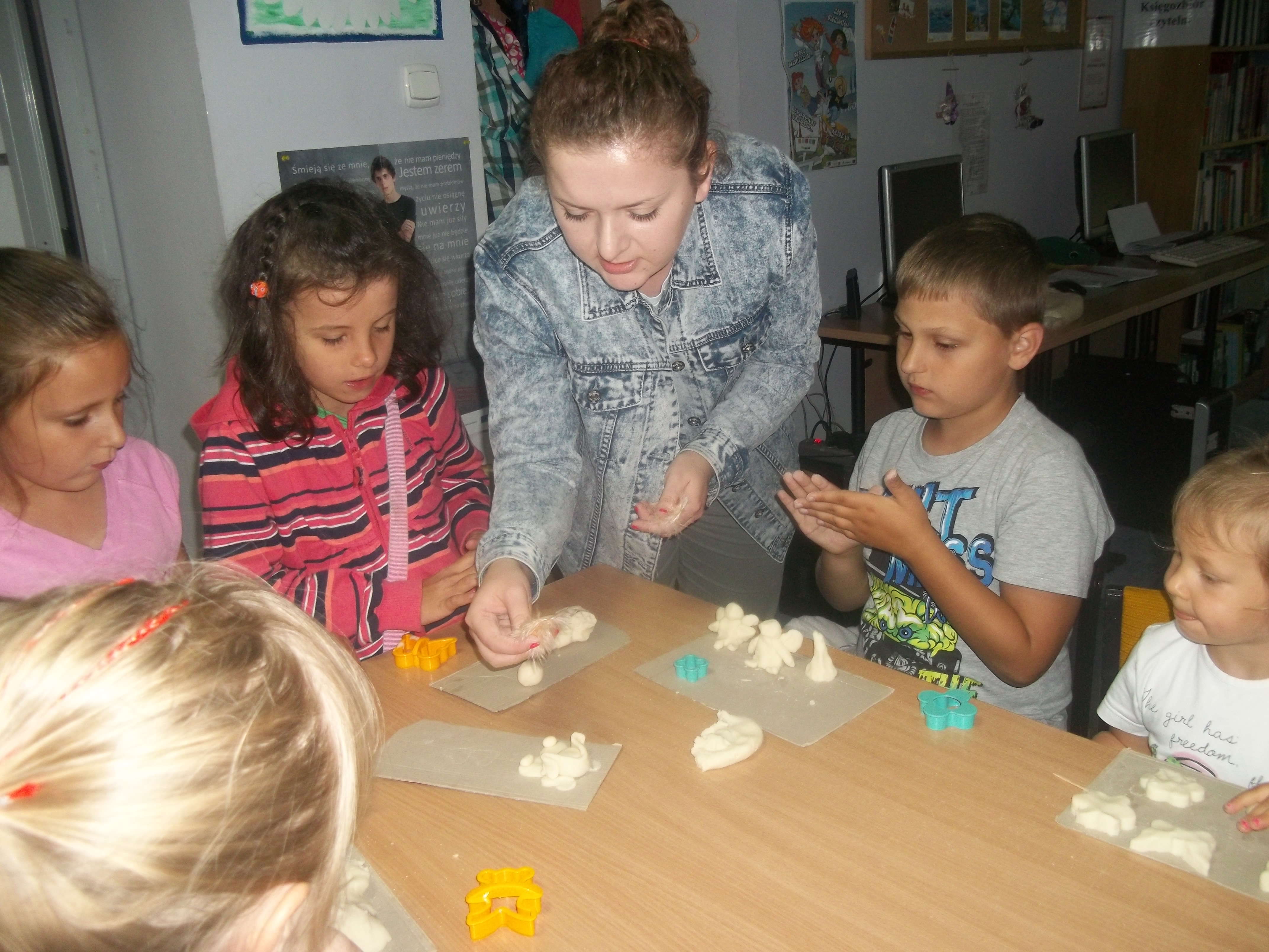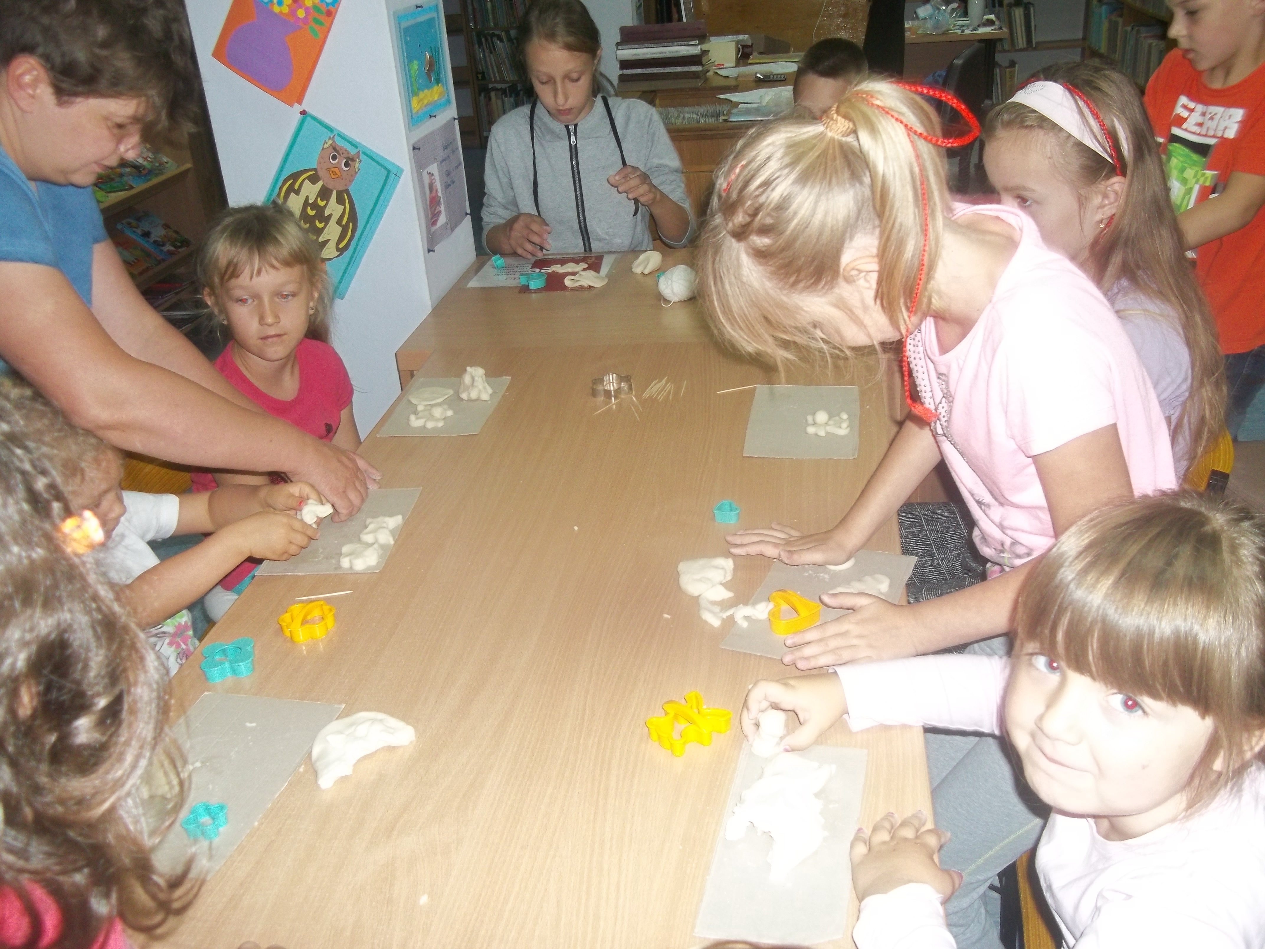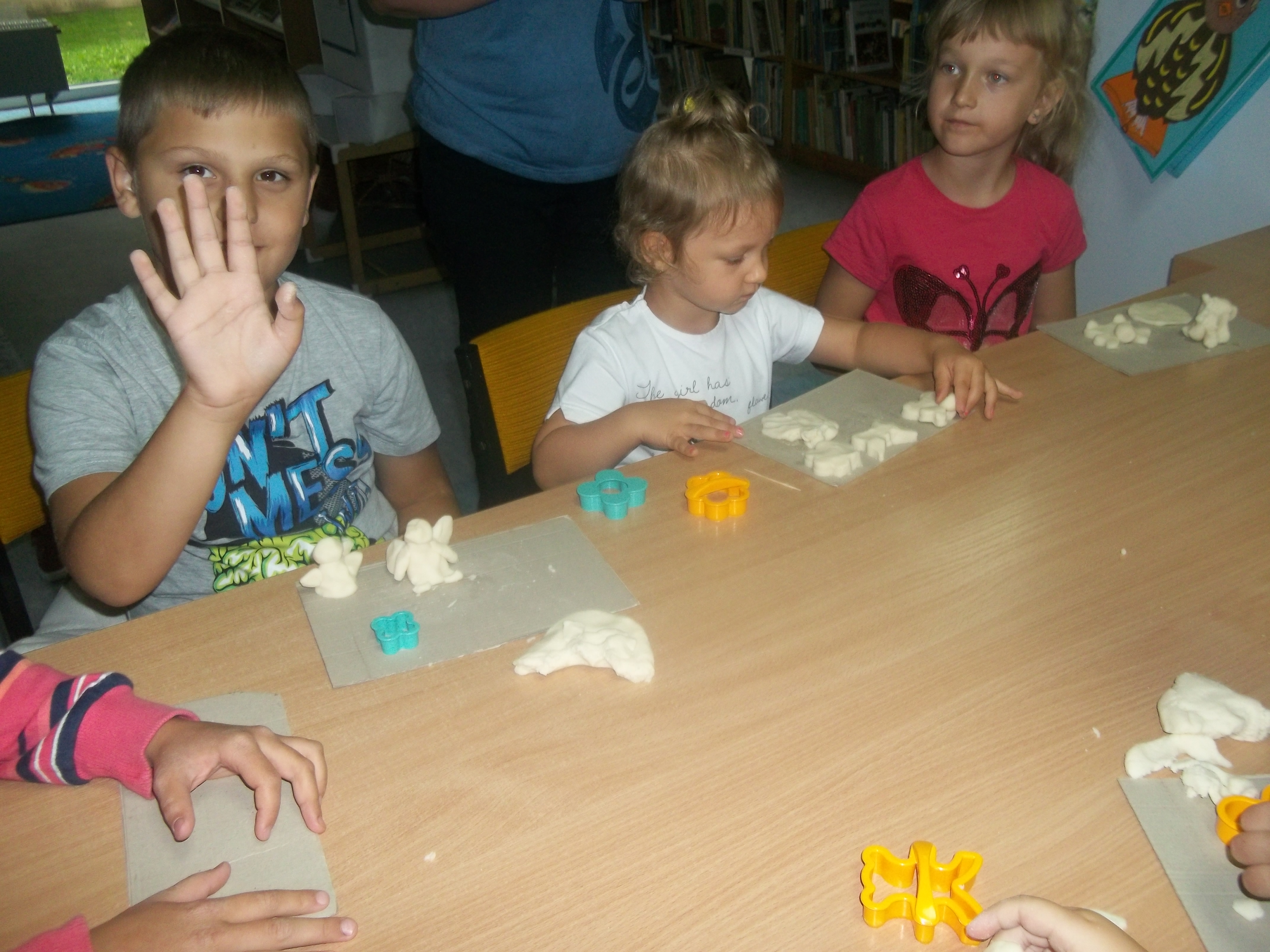Zabawy z masą solną – czyli ugniatanie, formowanie, kształtowanie. Bardzo dobre ćwiczenia dla zręcznych dłoni. Dzieci lepiły przeróżne postaci i kształty z masy solnej. Następnym etapem będzie ozdabianie, malowanie i upiększanie wykonanych prac.